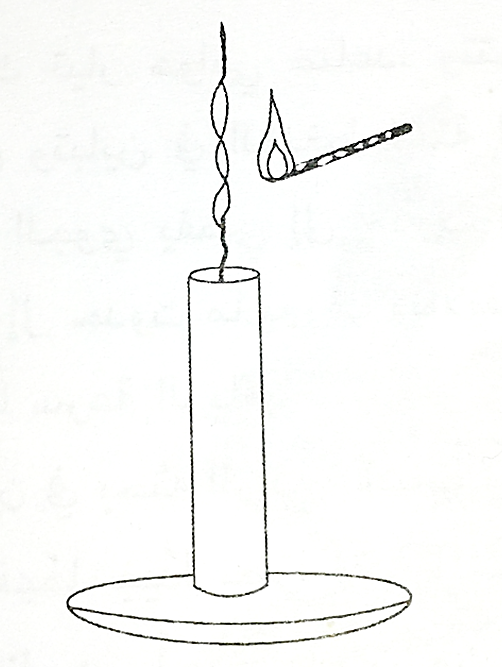 شكل ١ - ٣ - ١ : قرب عود ثقاب مشتعل من فتيلة شمعة مطفأة تؤا، فتجد أن اللهب يقفز عبر الفازات المحترقة ويشعل الفتيلة المطفأة مرة أخرى.