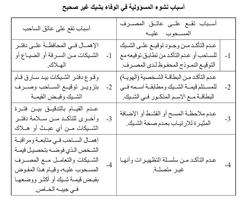 يمكن القول بأن مسؤولية الوفاء بشيك غير صحيح تقع على عاتق كل من المسحوب عليه والساحب. ومن أجل توضيح أسباب وقوع هذه المسؤولية بالنسبة لكل واحد منهما نعرض هذه الأسباب في الجدول التالي:
