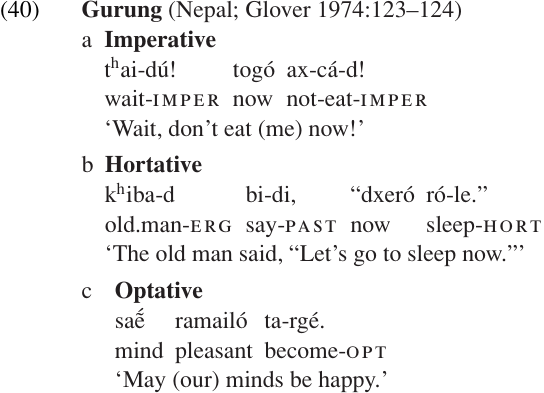 Some languages have a special mood for softened commands or exhortation, often called the HORTATIVE. Hortative mood is often used with first person inclusive reference, as in the English pattern Let’s go! Another similar category is the OPTATIVE, which marks something the speaker hopes for, or wishes would be true. Note the following three-way contrast in Gurung: