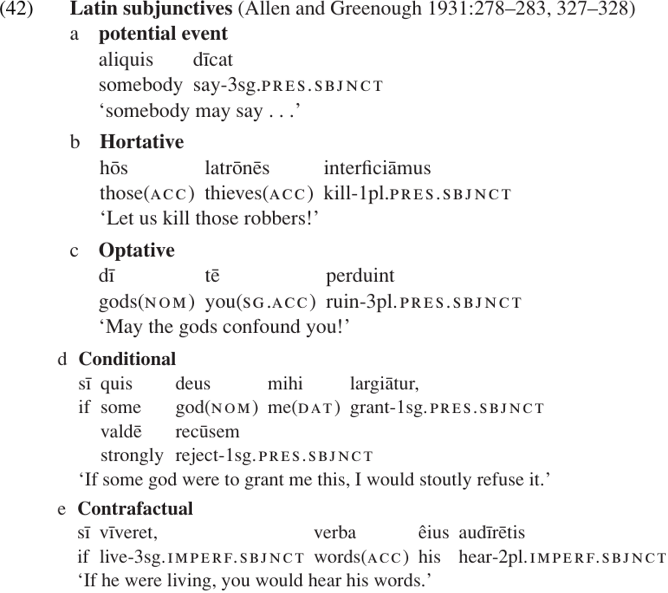 We have seen that there is often an association between irrealis mood and future tense, in tense systems that distinguish future vs. non-future, because future tense expresses situations which are not yet actual. These categories may also span the boundary between mood and modality. The optative and hortative moods can be associated with specific speech acts (wishing and exhorting) or intentions, and so fit into our basic definition of mood. But certain uses of the subjunctive (e.g. that in 42a) seem to relate primarily to the speaker’s degree of certainty about what he is saying. This is a type of modality, the category to which we now turn our attention.