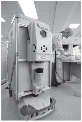 لقد استخدمت المركبات الموجهة آليا لعقود عديدة، وثَمة جيل جديد منها صار يُستخدم في بيئات بشرية للغاية من أمثلة ذلك، الروبوت «تج» من شركة أيثون: وهو روبوت لنقل المعدات في المستشفيات ويظهر في الشكل 1 في وقت كتابة هذا الكتاب يوجد أكثر من مائة روبوت من هذه الروبوتات تُستخدم في مستشفيات الولايات المتحدة، عادة لجلب الإمدادات الطبية، بما في ذلك الدم أو الأدوية، أو تسليم عينات للتحليل. ويتميز الروبوت بتصميم مثير للاهتمام فهو يتألف من حاوية على عجلات، مزودة بأقسام أو أدراج مصممة لحمل أي شيء، يجرُّها روبوت «سحب» صغير (ومن هنا جاءت التسمية «تج» التي تعني سحبا باللغة الإنجليزية).