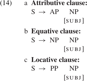 Without going into the formal details, we will adopt Bresnan’s analysis. Clauses generated by the PS rules in (14) will be well-formed because their non-verbal predicates have argument structures and assign the SUBJ relation.