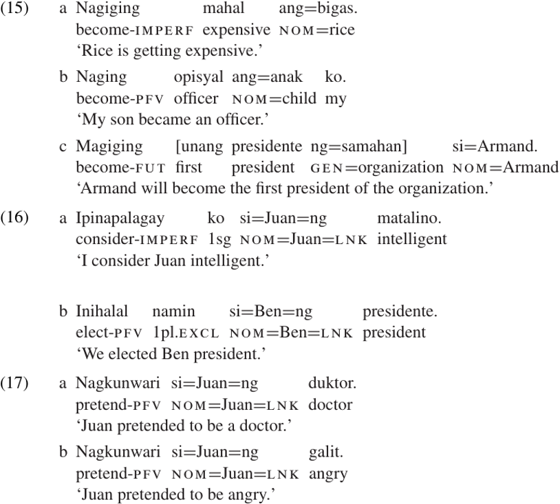 Even languages which have no copula may contain other verbs that require a predicate complement. One such verb in Tagalog is maging ‘become,’ which can take either AP (15a) or NP (15b) complements.4 The verb maging forms a tight constituent with its predicate complement, and is sometimes written as a prefix.5 However, its complement is a full phrasal category and not just a single word, as shown by examples like (15c);soit is (at least in its syntactic properties) a free form, and not an affix. Some other Tagalog verbs which take predicate complements are illustrated in (16–17).