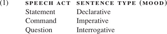 As we noted, the three most common things that speakers do by speaking are: (i) making STATEMENTS (asserting or denying the truth of a proposition); (ii) asking QUESTIONS (questioning the truth of a proposition, or asking for additional information about a proposition); and (iii) giving COMMANDS. Most languages have specific grammatical patterns that are used to indicate which of these actions the speaker in tends to perform: DECLARATIVE for statements; INTERROGATIVE for questions; and IMPERATIVE for commands. These three sentence types correspond to the MAJOR MOOD categories. The primary function of each major mood category is shown in (1).