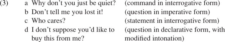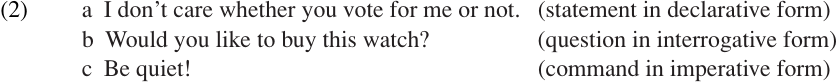 The table in (1) shows the typical or expected sentence type (i.e. grammatical form) that would be used for expressing a given pragmatic function. DIRECT SPEECH ACTS are those in which this expected correlation is preserved: the form of the sentence matches the purpose, or intended force, of the utterance. Some examples are given in (2).
