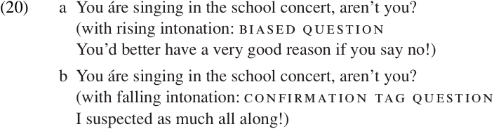 Two different uses of tag questions can be distinguished. The normal use is a request for CONFIRMATION. This construction is much the same as a simple declarative statement, with the tag question serving only as a request for feedback from the hearer. A second use of tag questions in English is to form BIASED QUESTIONS. This construction is a true request for information, in the sense that the speaker requires an answer from the hearer; but it signals an expectation or preference on the part of the speaker for one particular answer to be given.