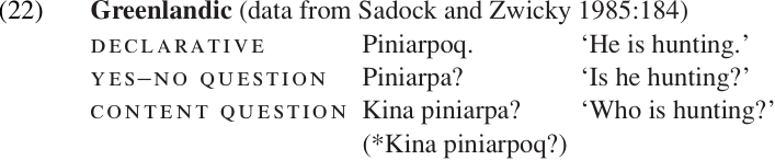 In some languages, devices which are used to mark Yes–No questions particles, interrogative mood affixation, special intonation, etc.–also occur (either optionally or obligatorily) in content questions. For example, the interrogative mood is obligatory in Greenlandic in both Yes–No questions and content questions (22). But these features are of secondary importance in content questions. The crucial defining feature of a content question is the presence of an interrogative (Wh-) word.