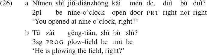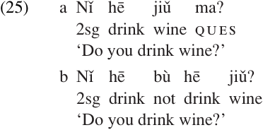 Mandarin has two basic strategies for forming Yes–No questions. One involves the use of a sentence-final particle ma (23c), while the other involves a kind of alternative question which is sometimes referred to as the “A-not-A” pattern (23d). As (24) shows, the alternative can involve either are petition of the verb alone (24b), of the verb plus object as a unit (26c), or of the copular verb shì ‘is’(24d).