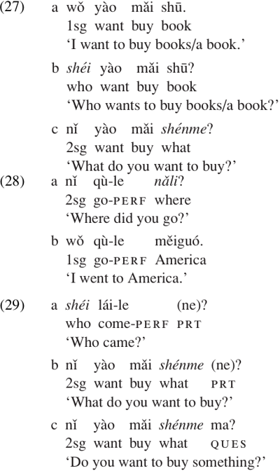 In Mandarin content questions, the question word remains in situ, as illustrated in (27–28). There is another sentence-final particle ne which optionally occurs in content questions (29a, b), but the Yes–No particle ma does not occur in content questions. If ma is added to a content question, the question word is re-interpreted as a quantifier (29c) and the whole sentence becomes a Yes–No question.