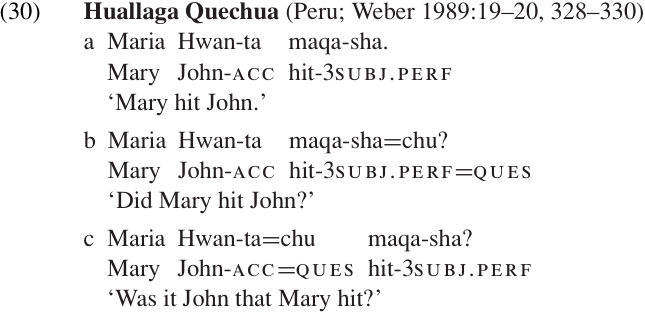 Yes–No questions in Quechua are marked by a clitic particle=chu. If this clitic attaches to the verb, as in (30b), the entire proposition is being questioned. But often the clitic attaches to another element in the sentence, as in (30c). In this case the constituent which hosts the clitic is the focal element of the question: the rest of the proposition is assumed to be true, and the questioner is asking only whether this particular piece of information is correct.