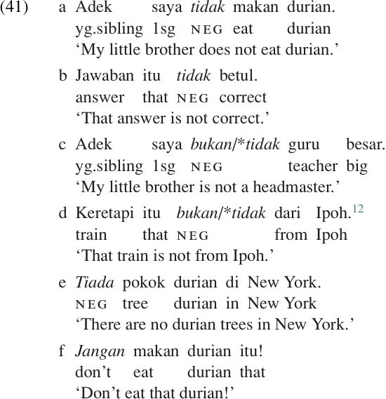 Payne (1985) suggests that the primary marker for clausal negation in any particular language can be identified by using weather predicates which take no arguments, e.g. It is not raining. Sentences of this type may be very useful because they are unlikely to contain quantifiers or negative adverbs, and are also unlikely to involve derivational negation (e.g. un- and dis-). However, we should remember that some languages use more than one strategy for marking clausal negation. For example, Malay uses the negative element tidak when the predicate is a verb (41a) or adjective (41b), and bukan when the predicate is an NP (41c) or PP (41d). In addition, there are special negative forms for existential clauses (tiada, 41e) and imperative clauses (jangan, 41f).11