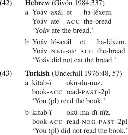 These negative markers in Malay are all independent word forms, as is the English not.13 This use of a free word or particle to express clausal negation is a very common pattern. In many other languages, however, negation is indicated by an affix on the verb.14 Some examples are given in (42–43).