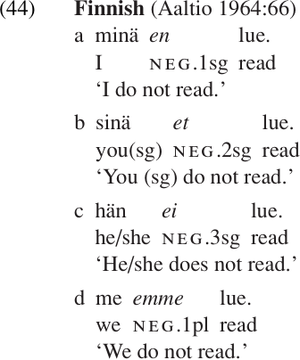 In a smaller number of languages, clausal negation is marked by a special negative auxiliary verb. In Finnish, for example, the negative auxiliary must agree with the person and number of the subject, as illustrated in (44).
