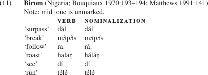 Tone changes are used morphologically in a number of tone languages. High tone is used as a derivational affix in Birom, marking deverbal nominalization: