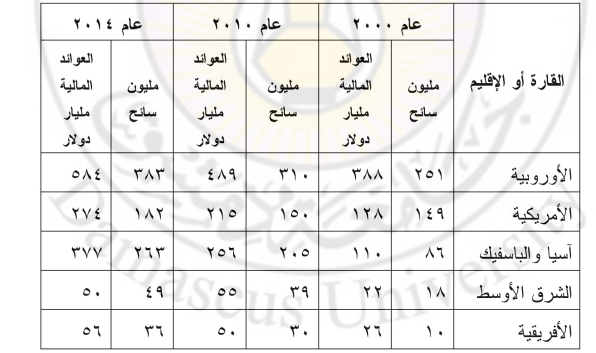 لقد أصبحت الخدمات السياحية الآن من أهم القطاعات الخدمية بالعالم فقد شكلت أكثر من ربع الصادرات، ونحو 2404 من الواردات الخدمية لعــــام 2013م، وبلغ معدل نمو السياحة العالمية خلال الفترة بين 2009 - 2013م أكثر من ، محققة عوائد مالية ضخمة على مستوى القارات فقد تفوقت دول القارة الأوروبية على بقية مناطق العالم في معدل نمو السياحة فيها، فبلغ عدد زوارها في عام 2014 نحو 383 مليون شخص، محققة عوائد مالية تزيد على 584 مليار دولار، وتلتها دول القارة الآسيوية بالمرتبة الثانية والأمريكية بالمرتبة الثالثة.