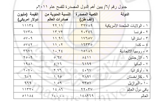 ويكاد إسهام المواد الغذائية في التجارة الدولية يقتصر على تجــارة الحبوب الغذائية واللحوم، ولاسيما تجارة الأرز والشوفان والذرة والشعير، وتعد تجارة القمح الأهم في تجارة مواد المحاصيل الزراعية المصدرة عالمياً، وعلى الرغم من احتلال الولايات المتحدة المرتبة الثالثة بإنتاجه عالميا بعد الصين والهند، نجد أنها احتلت المرتبة الأولى في تصديره ، فقد صدرت في عام 2011 م كمية (32789) ألف طن أي ما يمثل نحو 22.1 % من مجموع صادرات القمح عالمياً، وتلتها كل من فرنسا وأستراليا. ويبين الدول رقم / 6 / أهم الدول المصدرة للقمح في عام 2011م.