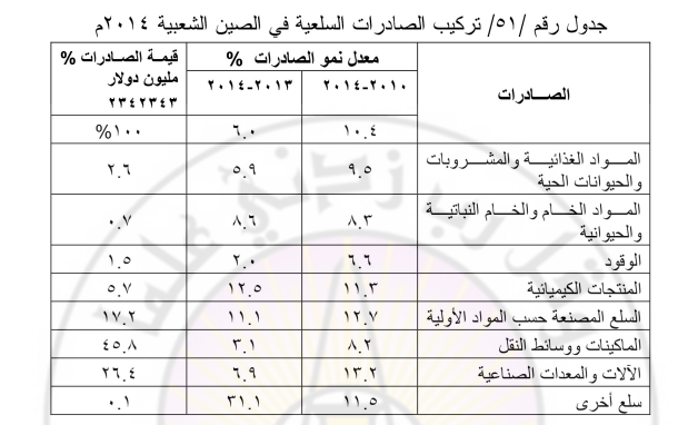 الصادرات الصينية يشكل نحو 6 %، وهو من أعلى المعدلات العالمية في حين انخفض معدل نمو الواردات من 8.8% إلى أقل من 1% خلال الفترة مــن 2010 إلى 2014م، وخاصة في واردات الوقود والمواد الخام الطبيعية والنباتية والحيوانية.