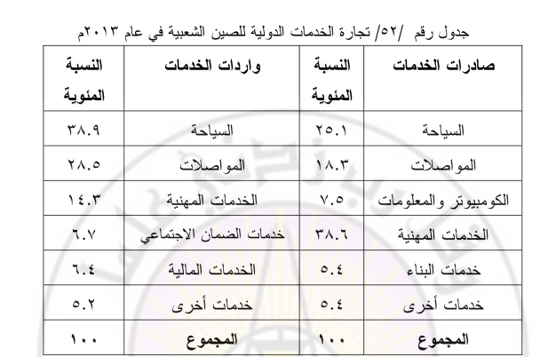 يتصف الميزان التجاري الخارجي للخدمات الدولية الصينية بالخاسر، فقد بلغت قيمة وارداتها نحو 33005 مليار دولار، في حين بلغت قيمة صادراتها نحو 206 مليار، أي بخسارة تبلغ نحو 12405 مليار دولار، ونظراً لاتساع سوق الصين الداخلية، فقد نمت الواردات الخدمية بمعدل عال بلغ نحو 17.6 %، حين بلغ معدل نمو الصادرات الخدمية 7.6 % بين عامي 2012-2013م. أما عائدات صادرات المهن الخدمية الصينية فقد شكلت في عام 2013م ، 70 مليار دولار، أي بنسبة 38.6 % تليها صادرات الخدمات السياحية نحو بنسبة 25.1 % وخدمات المواصلات بنسبة 18.3 %.