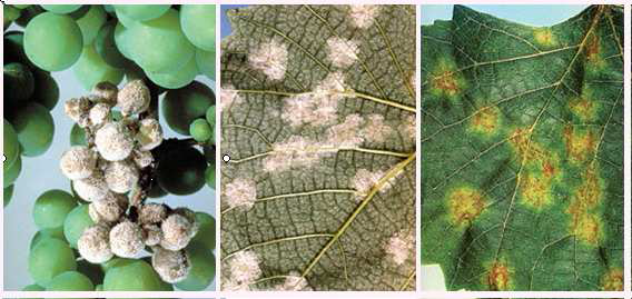 شكل يبين الاصابة بالبياض الزغبي على العنب السطح العلوي للورقة (يمينا) والسفلي (وسط) وعلى الثمار (يسارا)