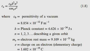If we apply the Bohr model to the H atom, the radius of each allowed circular orbit can be determined from equation 1.8. The origin of this expression lies in the centrifugal force acting on the electron as it moves in its circular orbit; for the orbit to be maintained, the centrifugal force must equal the force of attraction between the negatively charged electron and the positively charged nucleus.