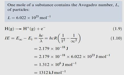 From equation 1.8, substitution of n = 1 gives a radius for the first orbit of the H atom of 5.293× 10 -11 m, or 52.93 pm. This value is called the Bohr radius of the H atom and is given the symbol a0. An increase in the principal quantum number from n= 1 to n=∞ has a special significance; it corresponds to the ionization of the atom (equation 1.9) and the ionization energy, IE, can be determined by combining equations 1.5 and 1.7, as shown in equation 1.10. Values of IEs are quoted per mole of atoms: