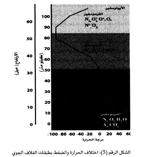 4 - طبقة الثرموسفير (Thermosphere) يطلق عليها بعض العلماء طبقة الأيونوسفير Ionosphere وتمتد إلى ارتفاع حوالي 450 كيلومترا عن مستوى سطح البحر. وترتفع درجة الحرارة في هذه الطبقة لتصل إلى حوالي 600م ولذلك فهي تحتوي على بحر من الأيونات الموجبة والسالبة تتأين جزيئاتها فتفقد الذرات إلكتروناتها الحرة وهذا يفيدنا كثيرا لأن لهذه الخاصية دورا مهما في انعكاس الموجات اللاسلكية والتلفزيونية وردها إلى سطح الأرض مرة أخرى. ولهذا فإن هذه الطبقة لها الفضل في انتقال البث الإذاعي إلى جميع أرجاء العالم. وتتميز هذه الطبقة أيضا بوجود بعض الظواهر الجوية مثل الوهج القطبي أو الأورورا Aurora وتسمى أيضا الشفق القطبي وتظهر غالبا في المناطق القريبة من القطب الشمالي وأحيانا في القطب الجنوبي وهي تظهر نتيجة لوجود تفريغ كهربائي خلال هذه الطبقة ذات الضغط المنخفض، مما يجعل جزيئات الهواء متأينة ومهيأة لحدوث التفريغ على هيئة مناطق مضيئة تشبه الإضاءة التي تحدث في لمبات الفلورسنت، إذ تظهر على أشكال متعددة منها حلقات مضيئة بيضاء وأحيانا برتقالية أو خضراء.
