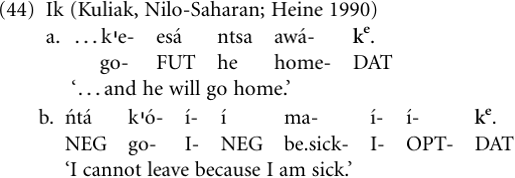 We will deal with this process in more detail in “Treating events like objects”; the following example illustrates the process. In the Ik language of north-eastern Uganda, which has an elaborate paradigm of case inflections, one of these inflections, the dative suffix-ke, has been extended to use as a clause subordinator (Heine 1990; König 2002). Example (44a) illustrates the use of the suffix as a nominal case inflection, while (44b) shows the very case marker being used as a subordinator. That this was a unidirectional process from nominal to clausal inflection is suggested by the fact that the former, but not the latter, can be reconstructed back to Proto Kuliak, the hypothetical ancestor of the family to which Ik belongs.