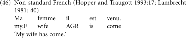 For example, the personal suffixes of Latin verbs functioned as personal pronouns since they expressed distinctions of personal deixis, for example am-at ‘s/he loves’, am-amus ‘we love’. In the development from Latin to French, distinctions of personal deixis came to be encoded by either absolute pronouns or nouns, with the result that the old personal pro nouns lost their function as deictic markers and survived as predictable markers of agreement between verb and subject, for example il aime ‘he loves’, nous aim-ons ‘we love’. But French appears to be undergoing a second development from personal pronoun to agreement marker: The new French personal pronoun il ‘he’ (derived from the Latin distal demonstrative ille (masculine) ‘that (one)’) has become an agreement marker in non-standard French, that is, a predictable form bound to the verb, no longer distinguishing number or gender, cf. (46). Accordingly, French il is suggestive of an extended pathway Demonstrative > pronoun >agreement (see Demonstrative > pronoun).