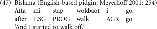 The final stage of grammaticalization is in fact reached when the erstwhile personal pronoun is no longer functionally distinctive, thereby becoming a ‘‘meaningless’’ appendage of the verb. For example, the English personal pronoun he turned in English-based Melanesian pidgins such as Tok Pisin of Papua New Guinea or Bislama of Vanuatu into a redundant proclitic i placed before the verb, initially only after third person subjects and later on via extension also to first and second person subjects, as in the following example: