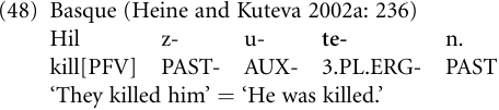 The Maasai dialect of the East Nilotic language Maa shows the final stage of this process, where the third-person plural pronoun *ki ‘they’ has lost its function as a personal pronoun and is now exclusively a passive suffix (-ki or-i) (Greenberg 1959; Heine and Claudi 1986: 79–84).