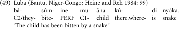In a number of languages, this process has given rise to fully-fledged passive constructions, where an adjunct noun phrase has been introduced to present the agent which was formerly expressed by the third-person plural subject pronoun (see Givo̒n 1979b: 188, 211 for a canonical ex ample and discussion; see also Givo̒n 2004). In the following example from the Congolese Bantu language Luba, the pronoun ba- ‘they’ of the human noun class 2 (C2) has been reinterpreted as a passive prefix, the patient is structurally a direct object, and the new agent is presented in the form of an existential phrase: