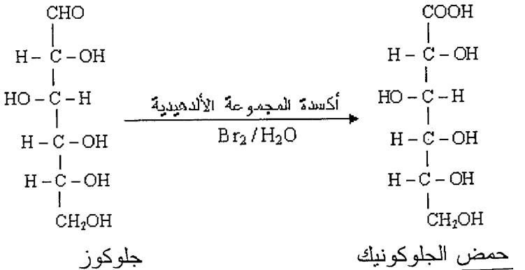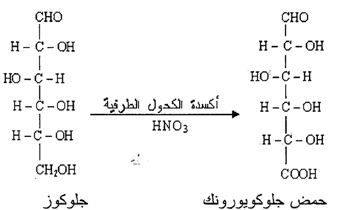 وقد تتم الأكسدة على مجموعة الكحول الطرفية (CH2OH) وتحولها إلى مجموعة كربوكسيلية (- COOH) أي تحول الجلوكوز إلى حمض جلوكويورونيك وفق التفاعل الآتي