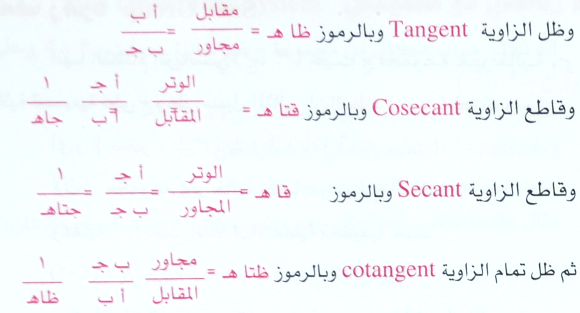 ومن هذا وذلك تنتج بقية النسب المثلثية والتي تسمى هنا بالاقترانات الدائرية من العلاقات التالية :