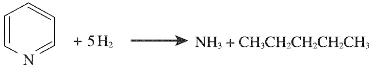 Organic nitrogen compounds occur in crude oils either in a simple heterocyclic form as in pyridine (C5H5N) and pyrrole (C4H5N), or in a complex structure as in porphyrin. The nitrogen content in most crudes is very low and does not exceed 0.1 wt%. In some heavy crudes, however, the nitrogen content may reach up to 0.9 wt %.l8 Nitrogen compounds are more thermally stable than sulfur compounds and accordingly are concentrated in heavier petroleum fractions and residues. Light petroleum streams may contain trace amounts of nitrogen compounds, which should be removed because they poison many processing catalysts. During hydrotreatment of petroleum fractions, nitrogen compounds are hydrodenitrogenated to ammonia and the corresponding hydrocarbon. For example, pyridine is denitrogenated to ammonia and pentane: