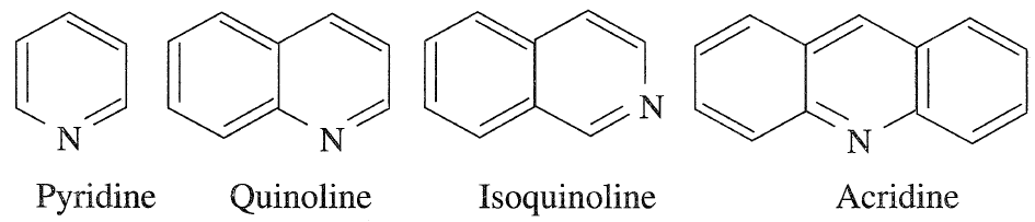 Nitrogen compounds in crudes may generally be classified into basic and non-basic categories. Basic nitrogen compounds are mainly those having a pyridine ring, and the non-basic compounds have a pyrrole structure. Both pyridine and pyrrole are stable compounds due to their aromatic nature. The following are examples of organic nitrogen compounds.