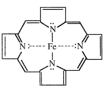 Porphyrins are non-basic nitrogen compounds. The porphyrin ring system is composed of four pyrrole rings joined by =CH-groups. The entire ring system is aromatic. Many metal ions can replace the pyrrole hydrogens and form chelates. The chelate is planar around the metal ion and resonance results in four equivalent bonds from the nitrogen atoms to the metal. Almost all crude oils and bitumens contain detectable amounts of vanadyl and nickel porphyrins. The following shows a porphyrin structure: