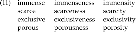 Aronoff and Schvaneveldt (1978) conducted an experiment to verify that productivity figures in individuals’ linguistic competence and to judge its consistency across speakers and words. The experiment focused on -ness, a native English suffix, and -ity, of Latin-Romance origin, which often attach to the same morphological and semantic classes of words. We see this in triplets like the following, where all three members can be found in a dictionary: