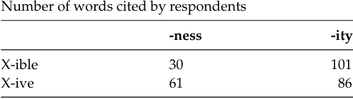 The number of nonce words in the subjects’ lists was much higher for the patterns ending in -ness than those ending in -ity, as shown in the following table.