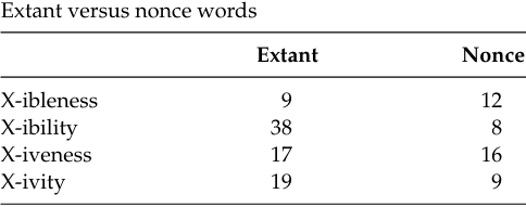 Another experiment yielded even more interesting results. Anshen and Aronoff (1988) tested the productivity of the patterns X-iveness, X-ivity; X-ibility, X-ibleness; and X-ional, X-ionary. We follow them in ignoring the last two, since the most interesting results have to do with the contrast between the behavior of -ity and -ness. Anshen and Aronoff asked their subjects, all native English speakers, to list on paper all the words they could think of that ended in these strings. They expected that speakers would come up with more forms in the more acceptable, and therefore more productive, patterns (X-iveness, X-ibility). In fact, speakers listed more forms for both the X-ibility and X-ivity patterns than for the other two, as shown in the following table (Anshen and Aronoff 1988: 644).