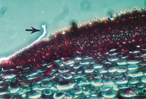 شكل رقم (2): الجراثيم كونيدية المتكونة على البقع المتكشفة على الأوراق