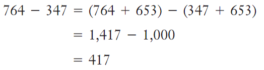 Another algorithm for subtraction is called “subtraction by taking complements.” Consider 764 - 347 again. Adding the same number, c, to both the terms will not affect the answer, because c + (-c) = 0. So effectively the value does not change.