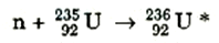 حيث تعبر U* عن النواة المركبة، التي سرعان ما تضمحل عن طريق واحد من عدة تفاعلات محتملة. والتفاعل التالي ليس سوى أحد هذه الاحتمالات: