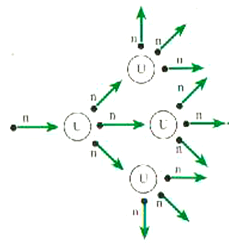 حيث أن انشطار نواة 235U واحدة يؤدي في المتوسطة إلى انتاج ثلاثة نيوترونات وحيث أن النيوترونات هي التي تستحث نوى 235U على الانشطار لذا فإن التفاعل المستمر ذاتياً يصبح ممكناً. تخيل كتلة من 235U من الكبر بحيث يكون عدد النيوترونات التي تهرب من سطحها ضئيلة جداً مقارنة بالعدد الكلي للنيوترونات ومن ثم، إذا اقتحم نيوترون نواة 235U ، فإنه يؤدي إلى ظهور ثلاثة نيوترونات ، مثلاً، عندما تنشطر النواة. (لقد وجد بالتجربة أن العدد المتوسط لتلك النيوترونات هو 2.47). وتقوم النيوترونات الثلاثة هذه بجعل ثلاثة أنوية اخرى تنشطر ، فيتحرر بذلك ما مجموعه 32 = 9 نيوترونات. وهذه النيوترونات تؤدي إلى انشاط مجموعة أخرى من النوى فينتج 33 نيوتروناً، وهكذا. وهذه العملية التي يصورها الشكل 28-13 هي المسماة بالتفاعل المتسلسل وإذا تكررت q خطوة في التفاعل المتسلسل، يصير لدينا 39 نيوترون وإذا استغرقت كل خطوة 0.01 s فإنه بعد مرور ثانية واحدة، يصير العدد الكلي للنيوترونات 3100 ≈ 1048 ولما كانت 235 kg من اليورانيوم تحتوي على 6×1026 ذرة فحسب، أصبح من الواضح أن تفاعلاً كهذا لابد أن يحدث بعنف متفجر.