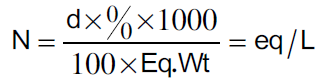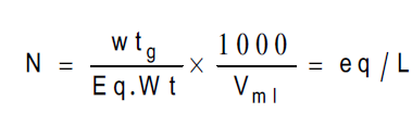 ووحدتها (مكافئ/لتر، مللیمكافئ/مللتر) وهي عدد المكافئات الجرامیة من المادة المذابة N ویرمز لها بالرمز في واحد لتر من المحلول، وتستخدم العلاقة التالیة لحساب عیاریة محلول أى مادة كیمیائیة أذا علمت حجم المذیب ووزن المذاب (وزن المادة).