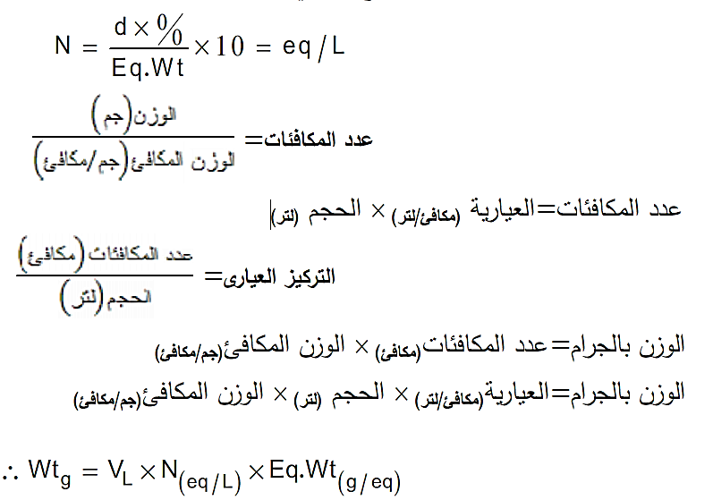 اما بالنسبة للعلاقة التالیة فتستخدم لحساب عیاریة المحالیل المركزة (محالیل الاحماض والقواعدالمركزة)