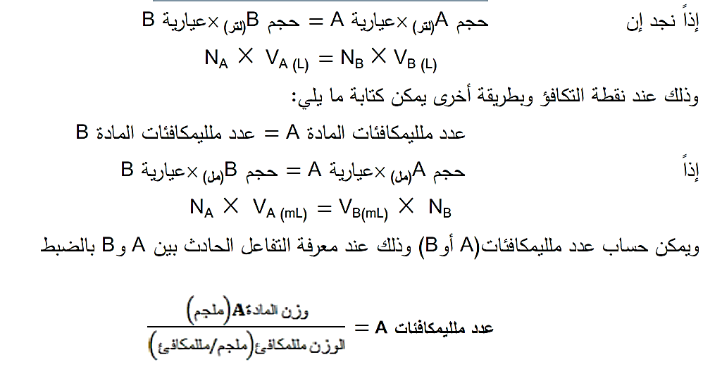 عدد مكافئات المادة = B عدد مكافئات المادة A
