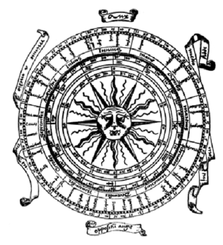 This undated calendar with Latin text tracks Venus as seen by Earth throughout the year. It depicts an unhappy Sun in the center with rings representing the Zodiac, months, dates, and Venus’ phases.