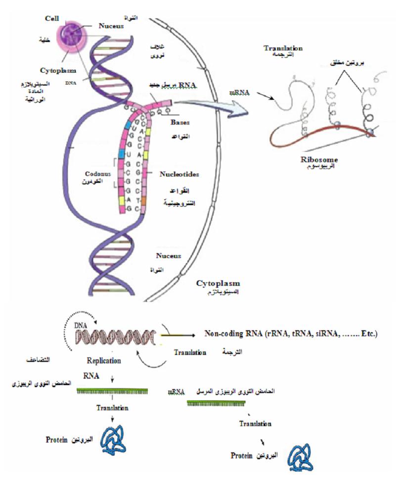 تحتوي الخلية على مجموعة من الحامض النووي الناقل tRNA وهي عبارة عن جزيئات من الاحماض النووية الرابيوسومية صغيرة الطول (70-90) نيوكليتيدة يسمح بتركيب جزئ الحامض النووي tRNA بوجود موقعين نوعيين يمكن لاحدهما ان يتعرف على الحمض الاميني ويرتبط به بمساعدة انزيم نوعي يسمى الحامض النووي tRNA synthetase في حين يقوم الموقع الاخر وهو المحتوى على الكودون المضاد والذي يحتوي على ثلاث قواعد بالتعرف على الكودون الموجود في تتابع جزئ الحامض النووي mRNA مما يسمح للأحماض الامينية ان تصطف طبقا لهذا التتابع النوكليتيدي. ويوجد لكل حمض اميني الحامض النووي tRNA أو اكثر والذي يعد بمثابة عربة لنقل الاحماض الامينية من السيتوبلازم الى الرابيوسوم حيث يتحد الحمض الاميني والمعين مع احدى نهايتي الحمض النووي الرابيوسومي في حين يتم التزاوج الصحيح بين الكودون بالروابط الهيدروجينية، وعليه يقوم الحامض النووي tRNA بدور اساسي كوسيط في عملية الترجمة او يقوم بتحويل تتابع النيوكلتيدات الى تتابع من الاحماض الامينية وفي نفس الوقت يتم تكوين رابطة ذات طاقة عالية عند النهاية الكربوكسيلية لهذا الحمض بحيث يمكنها ان تتفاعل مع المجموعة الامينية للحامض الاميني التالي (شكل 1).
