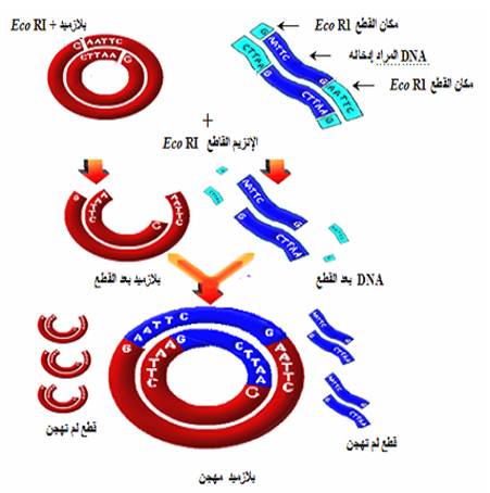 - بعد ان يتم تحديد القطعة المراد نسخها يضاف اليها انزيم قاطع محدد وليكن مثلا انزيم (ا) فيقوم هذا الانزيم بقطع الدنا في مكان محدد حسب التسلسل النيوكلوتيدي