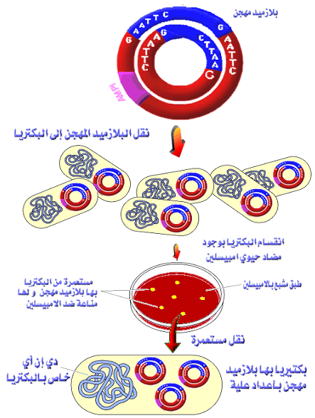 باختيار المستعمرات البكتيرية التي تحتوي على الناقل والقطعة المهجنة مع تكاثر الخلايا البكتيرية وتكاثر البلازميد التي بداخلها ينتج لدينا اعداد كثيرة من المستعمرات البكتيرية وبها البلازميد المهجن . ولكن قد يكون في داخل الطبق الذي زرع فيه البكتيريا التي تحتوي على البلازميد المهجن فانه عادة ما يتم استعمال ناقلات عليها جينات واقية من المضادات الحيوية ، كالجين الواقي من المضاد الحيوي امبيسيلين اوالتتراسكيلين وغيرها . وبذلك فالمضاد الحيوي سوف يمنع تكاثر اي خلية بكتيرية لا تحتوي على البلازميد المهجن .